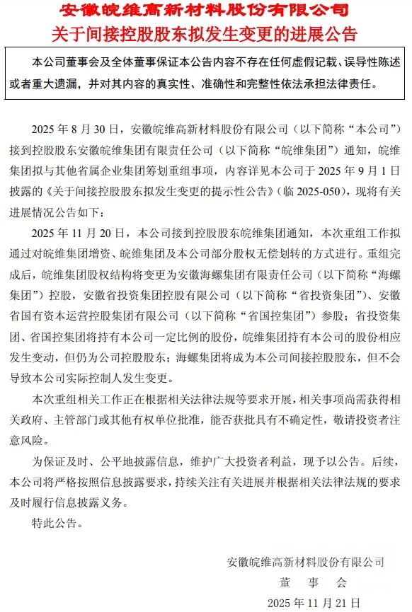 11月21日,皖维高新发布《关于间接控股股东拟发生变更的进展公告》显示,2025年8月30日,公司接到控股股东安徽皖维集团通知,皖维集团拟与其他省属企业集团筹划重组事项。