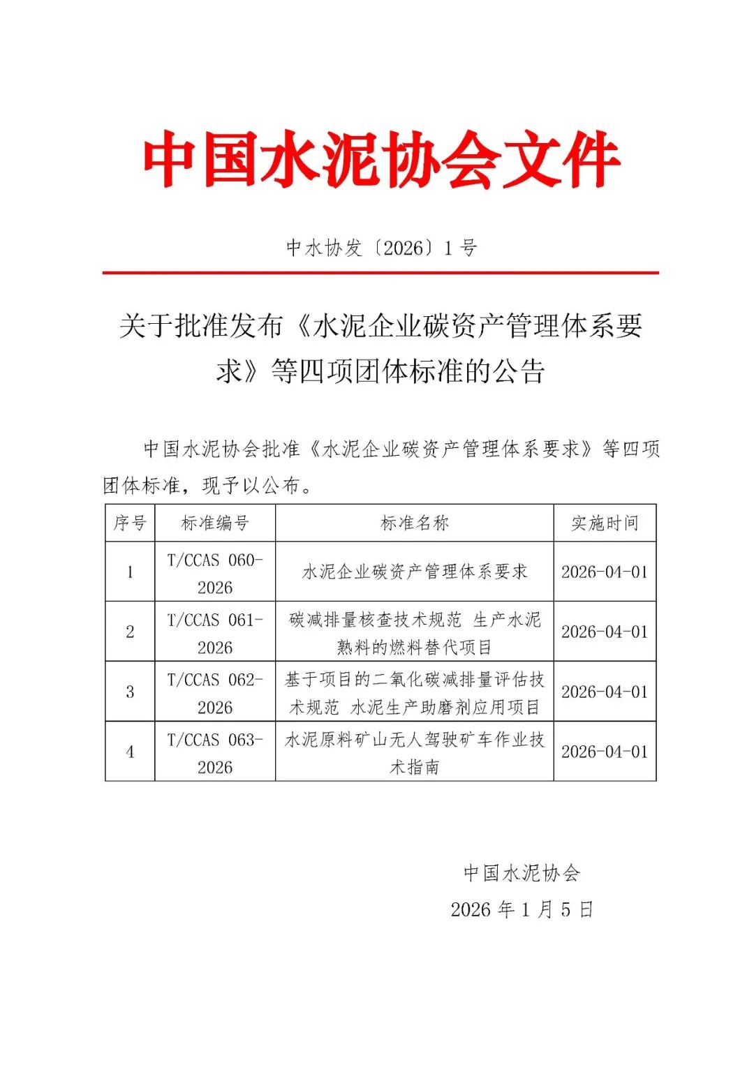 关于批准发布《水泥企业碳资产管理体系要求》等四项团体标准的公告